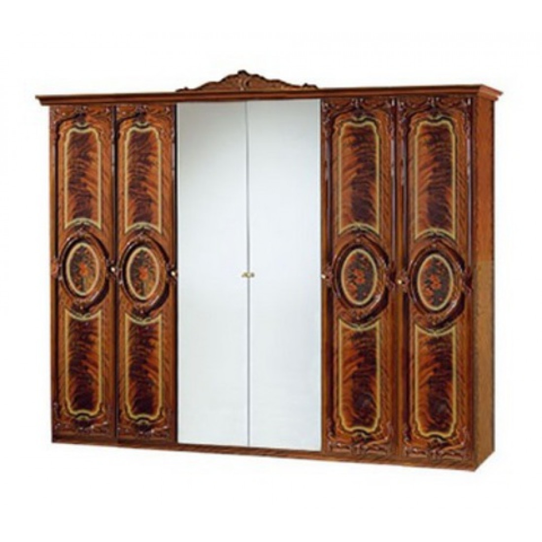 Шестистворчатый шкаф для одежды Роза (орех) от Российской фабрики "ДИА мебель". Модель шкафа выполнена в классическом стиле. Ореховый цвет с глянцевым покрытием придает больше эстетичности. Два больших зеркала в центре с легкостью придадут чувства легкости и визуально расширят пространство в комнате. Шкаф поделен на три части, каждая из которых имеет не только вместительные полки для одежды но и большую штангу для вешалок.